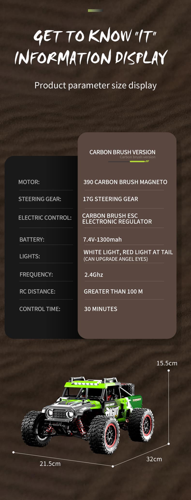 ✅ Оснащен 3,2-дюймовыми внедорожными колесами и приподнятым шасси 🚵. Улучшает проходимость автомобиля, позволяя преодолевать различные дорожные условия.